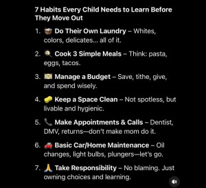 But I found a simplistic approach to life that really can be done in 7 steps, in a matter of minutes, and have oodles of hours leftover for balancing all the life you want. And I found it on the Internet. On social media even! The seven things one must master to become an adult. It was actually one of those cutesy images and its title was ‘7 Habits Every Child Needs to Learn Before They Move Out.’